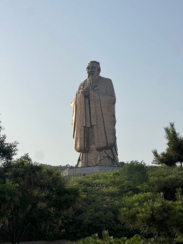 當實踐隊員踏入尼山圣境,最先闖入視野的,是那座矗立山巔的72米高孔子像——72米的高度暗合孔子弟子七十二賢之數,他身著垂落的寬袖長袍,雙手交疊于胸前,衣袂似有微風拂過般微微揚起。雕像面容溫和中透著莊重,俯瞰著這片孕育了儒家文化的土地。實踐隊員們表示:站在孔子像下仰望,山風穿過松林的簌簌聲里,竟似能聽見“三人行必有我師”的箴言在回響,一股莫名的敬畏感從心底升起,仿佛與兩千多年前的先哲完成了一場無聲的對話。