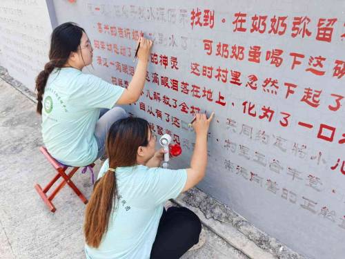 洼子村村委會主體墻面的村史介紹文字歷經風雨侵蝕,出現顏料剝落、字跡漫漶現象,影響鄉村歷史文化的有效傳播。實踐團成員抵達后系統開展損毀勘查與修復區域標注工作。實踐團成員在過程中貫徹歷史風貌保護理念,確保修繕成果的信息可讀性。