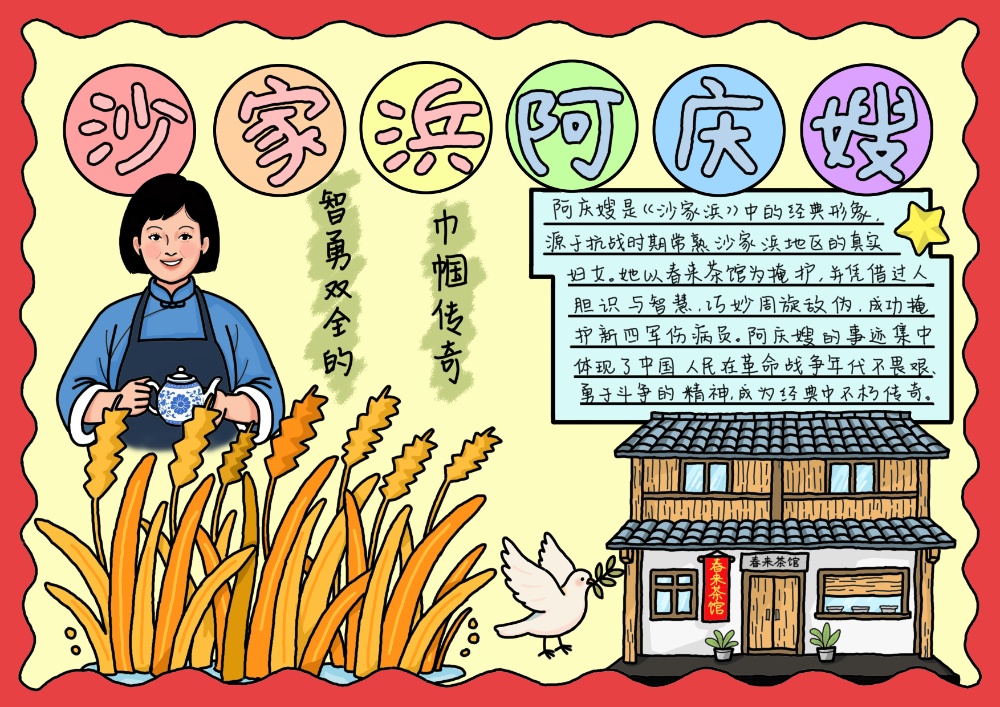 志愿者李方婧還繪制了阿慶嫂主題海報。海報中,阿慶嫂從容機智的形象躍然紙上,碎花短褂勾勒出經(jīng)典模樣。志愿者表示,希望通過畫筆重現(xiàn)《沙家浜》經(jīng)典場景,讓年輕一代感受革命群眾的智慧與擔當,讓紅色故事煥發(fā)新活力。