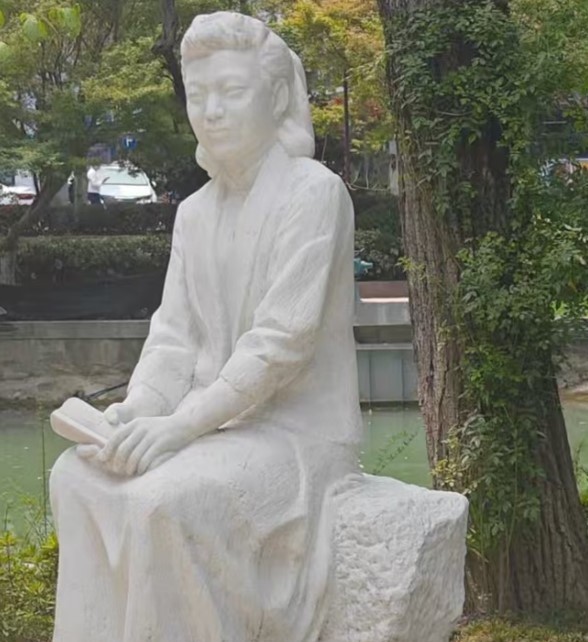王瑩雕塑,通體漢白玉雕刻而成,雕塑背面刻有“藝壇才女、巾幗先驅”,由陽翰笙題寫。王瑩,1913年出生于安徽蕪湖,原名喻志華,曾用名王克勤。她是中國話劇、電影演員、女作家,畢業于上海藝術大學文學系。1930年加入中國共產黨,先后參加辛酉劇社、上海業余劇人協會等左翼進步戲劇社團。王瑩作為話劇和電影表演藝術家,在民族危亡之際,沒有局限于個人演藝事業,而是將藝術與革命緊密結合。她投身抗日救國洪流,通過主演話劇、電影傳遞愛國情懷,更在南洋開展募捐演出,用實際行動支援祖國抗戰。這種以藝術為武器,為民族解放吶喊、為國家存亡奔走的擔當,正是革命精神中“以己之長,為國效力”的生動體現。