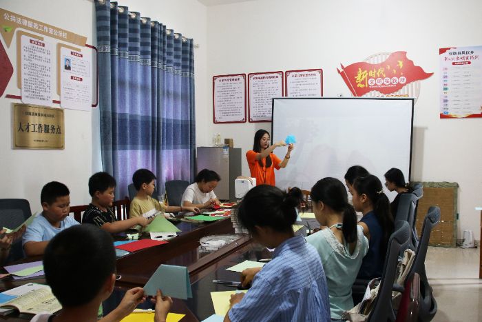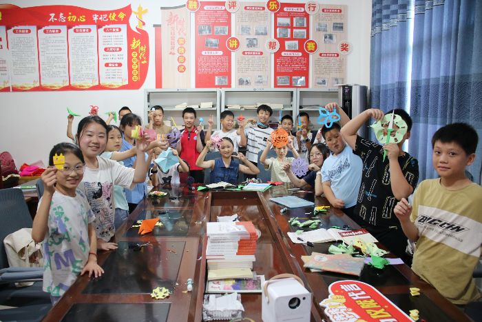 講解結(jié)束后,孩子們迫不及待拿起彩紙與剪刀,有的模仿視頻中的蝴蝶造型,指尖雖有些顫抖卻格外專注;有的發(fā)揮想象,剪出帶著鄉(xiāng)土氣息的房屋與麥穗,志愿者在旁細心指導(dǎo),活動室里剪刀開合聲與歡笑聲交織成趣。