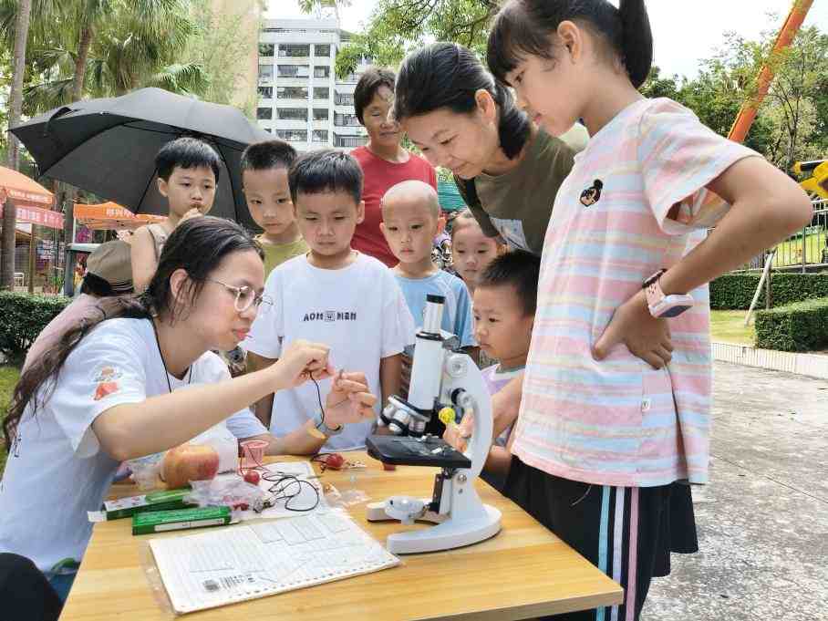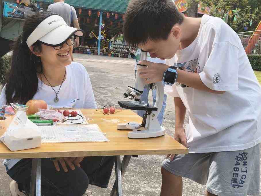 “顯微鏡探索”區(qū)更是人氣爆棚。隊(duì)員們準(zhǔn)備了洋蔥表皮、山楂切片等多種玻片標(biāo)本,孩子們?cè)陉?duì)員們的耐心講解下,學(xué)習(xí)顯微鏡的使用方法。