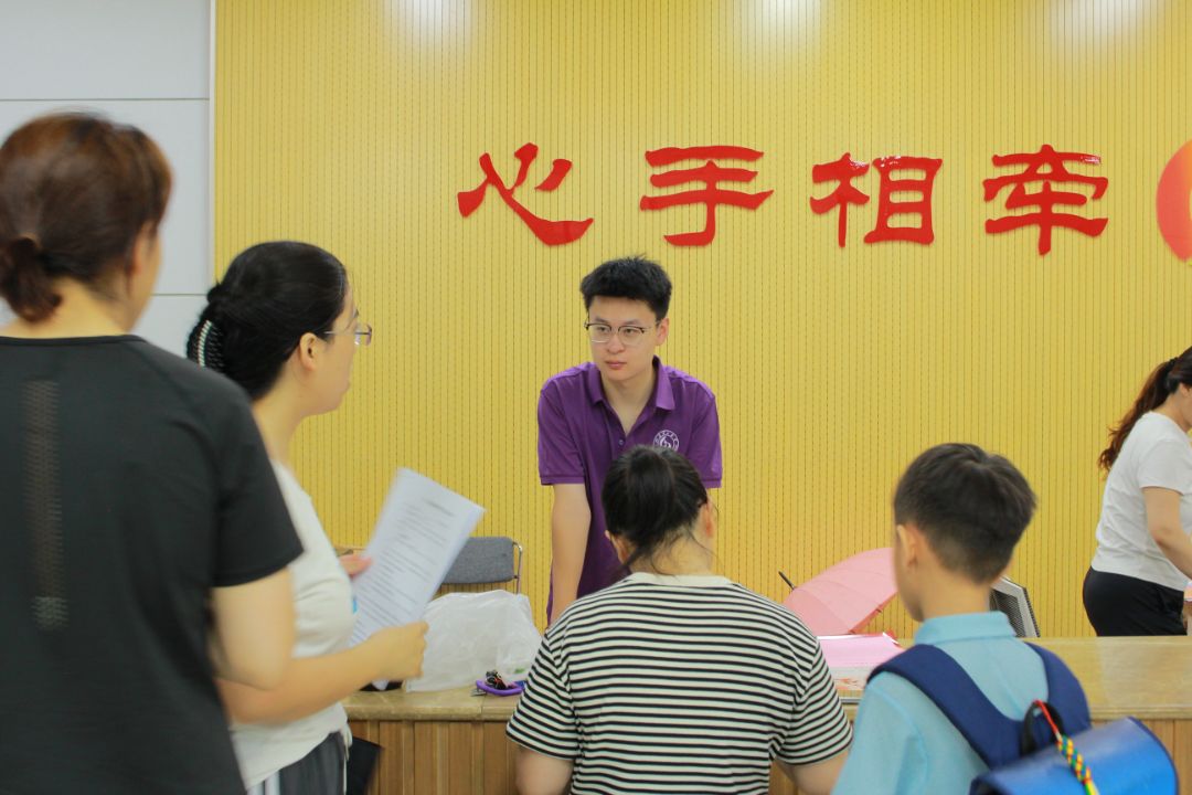 成員們來到社區后,已經有不少想要了解“齊小團”暑期課堂的家長在此進行等待,進行“齊小團”第二期的報名工作。此時社區工作人員也已忙得不可開交。工作人員們看到實踐團成員們的到來,首先對大家進行了鼓勵,然后根據現場情況給成員們安排了工作——幫助指導“齊小團”暑期課堂學生家長填寫報名表。成員們根據任務流程,將工作分為接待、填寫、電腦錄入等環節,成員們各司其職,保證井然有序的同時更好地完成工作,做到高效率、人滿意。