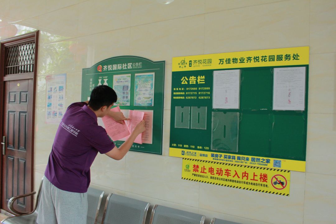 在大廳進行填表的同時,其余成員也如火如荼地進行著在樓道和電梯間的公告欄投放老年人意外險和高齡津貼通知的工作。將投放地點選在樓道等一些公共區域,能夠最大程度的讓居民們了解到政府的相關政策,做到精準投放,讓公益與服務有效果。實踐團成員也根據樓中居民人數,仔細考量投放與張貼的數量。成員們耐心細致,不遺漏一處重要區域,不讓居民因辦事多跑一步,讓暖意隨溫情服務不斷蔓延生長。