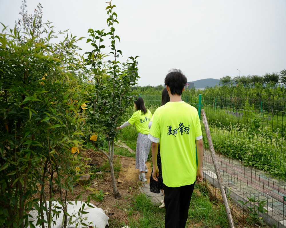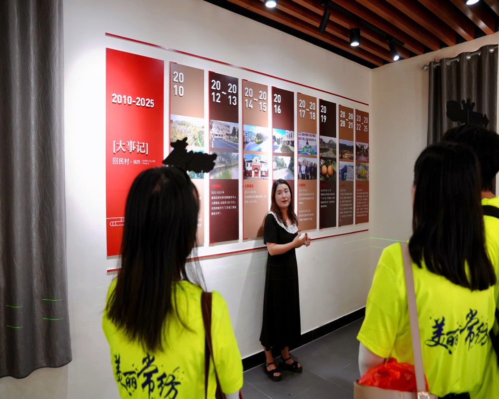 離開村史館,實踐團來到土播營數字農旅園,負責人徐田詳解了“互聯網+農文旅”的振興路徑。這座占地35畝、被水系環繞的園區,以土撥鼠IP為核心,構建起“數字電商+技術培訓+場景改造”的產業生態:800畝荒山散養的生態雞、桃園里的前置直播間、土撥鼠土灶烹制的特色雞煲,通過直播引流走向全國;針對從事農產品和鄉村旅游從業者的電商培訓,讓水蜜桃、翠冠梨等農產品搭上“數字快車”;溪水邊的DIY船競賽等互動場景,更讓鄉村成為“可體驗、可傳播”的網紅地。