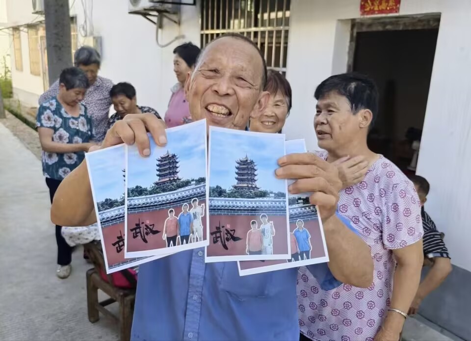 技術(shù)溫度在朱新街村蜿蜒的巷道里流淌。村委干部李興平拖著不便的右腿,駕駛?cè)嗆囘\(yùn)送器材,載著團(tuán)隊(duì)為行動(dòng)不便的老人拍攝“銀齡留影”。成像設(shè)備精準(zhǔn)捕捉皺紋里的歲月,PS技術(shù)合成“黃鶴樓”“故宮”背景。當(dāng)覆膜相紙遞到老人手中,六小時(shí)的奔波化作相紙上跳動(dòng)的光斑與濕潤(rùn)的眼角。