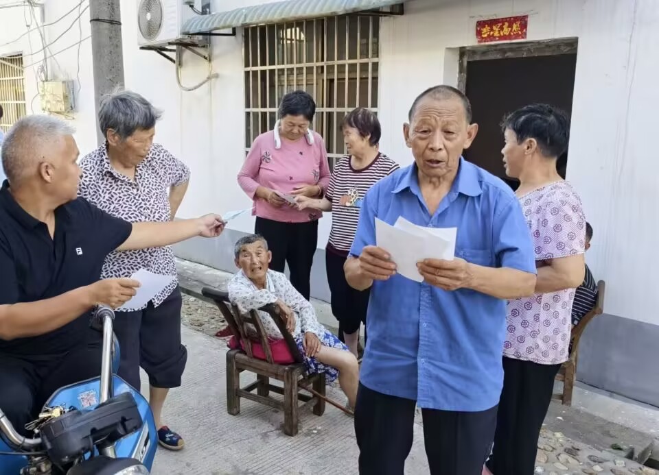 圖為團(tuán)隊(duì)成員為村民發(fā)放照片,程鑫攝