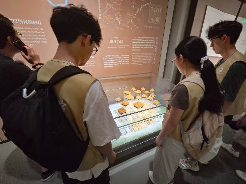 下午,山東省博物館的“海岱日新——山東歷史文化陳列”展廳內,黃“菏”入海流實踐隊的目光既落在戰國“鴻溝”水利工程、明清“束水攻沙”技術等古代治水遺跡上,也停留在大汶口文化陶器、龍山文化黑陶、秦漢農耕工具、唐宋漕運文物等展品間。前者展現著古人因勢利導治理黃河水患、守護水土的智慧,讓隊員們體會到人與黃河相處的千年探索;后者則以器物為證,勾勒出黃河流域水土環境與山東地域文明發展的深層關聯,二者共同訴說著這條大河與沿岸生靈相依相生的漫長歷程。