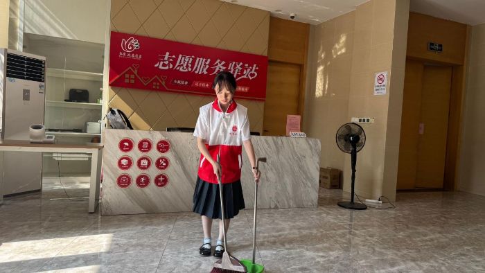 在驛站大廳,他們手持掃帚、簸箕,仔細清理每一處角落灰塵與地面雜物,不放過任何衛生死角。掃帚揮動間,原本略顯雜亂的環境逐漸變得整潔清爽,用實實在在的勞動,生動詮釋“奉獻、友愛、互助、進步”的志愿精神,讓驛站以更溫馨的面貌迎接居民。