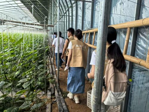 活動伊始,實踐隊抵達駭河甜源聯合黨委黨群服務中心。在服務中心工作人員的引導下,隊員們觀看宣傳片,深入了解駭河甜源的整體布局、種植規模及核心產業方向。走進連片的黃瓜大棚,看著棚內藤蔓間掛滿飽滿的果實,隊員們俯身觀察滴灌管道的鋪設走向,仔細詢問溫濕度調控設備的運行原理,不時用手機記錄下智能化灌溉設施與作物生長狀態的聯動細節,深入研究這套既節水又能保障作物品質的生長系統。