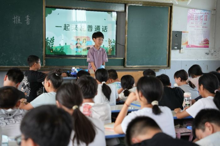 實(shí)踐隊(duì)隊(duì)員辛靜微以“普通話的意義”為主題,深入闡釋了普通話作為國家通用語言在消除溝通障礙、促進(jìn)社會交往中的基礎(chǔ)性作用。課堂上,學(xué)生們通過對比方言與普通話發(fā)音差異,直觀體會到語言統(tǒng)一的重要性。學(xué)生主動翻查字典核對平翹舌音,在筆記中重點(diǎn)標(biāo)注“規(guī)范發(fā)音”等細(xì)節(jié)。學(xué)生初步建立起了“普通話溝通更高效”的認(rèn)知。