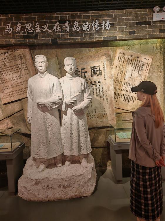 踏入中共青島黨史博物館室內展廳,一股莊重肅穆的氣息撲面而來。首先映入眼簾的是馬克思主義在青島傳播主題展區的雕塑,刻畫了王盡美與鄧恩銘兩位革命先驅,他們身著長衫,神情堅毅,讓實踐隊員感受到堅定信仰與革命精神。