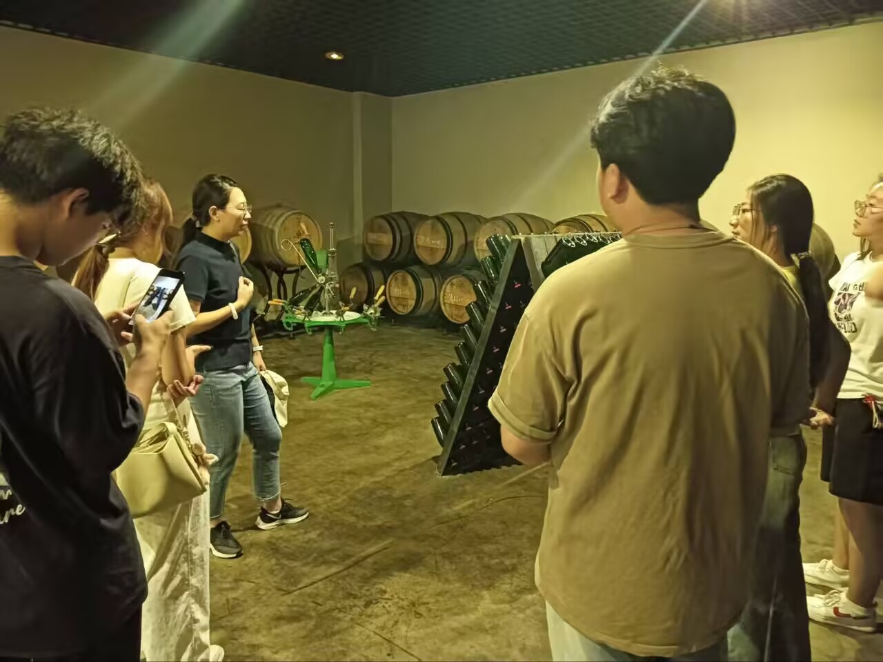 調研中,酒莊深厚的歷史文化底蘊與精湛工藝同樣吸引著同學們的目光。對外開放的展示中心由10000只酒瓶搭建而成,頭頂1978只酒杯巧妙呼應建莊年份,館內陳列的建廠初期樣品、北京奧運會特制葡萄酒等展品,串聯起酒莊的發展脈絡。而采用傳統工藝釀造高端起泡酒的車間,更讓同學們直觀感受到釀造技藝的傳承與堅守。