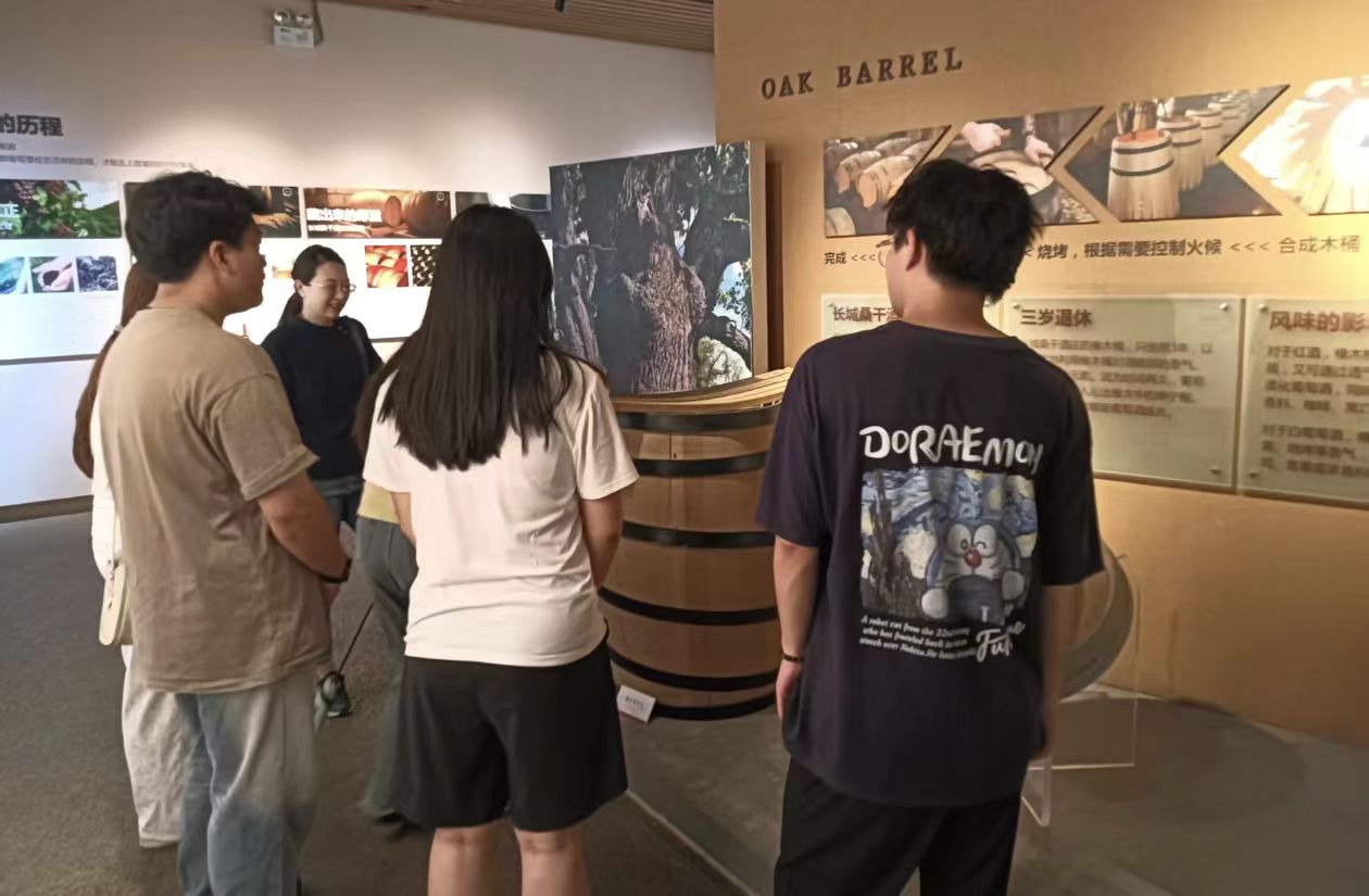 除綠色發(fā)展實踐,學(xué)生們還深入挖掘葡萄酒文化與釀造工藝。酒莊展示中心別具匠心,以萬只酒瓶構(gòu)建空間,1978只酒杯呼應(yīng)建莊年份,館內(nèi)陳列的建廠初期樣品、北京奧運會特制葡萄酒等,串聯(lián)起產(chǎn)業(yè)發(fā)展的歷史脈絡(luò)。走進起泡酒車間,傳統(tǒng)釀造工藝的精細流程一一呈現(xiàn),高端品質(zhì)背后的匠心,讓學(xué)生們對葡萄酒釀造的文化傳承與技藝堅守有了更深認知。