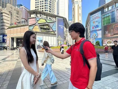 圖為實(shí)踐隊(duì)員在解放碑采訪當(dāng)?shù)鼐用瘛?陳梓萌供圖