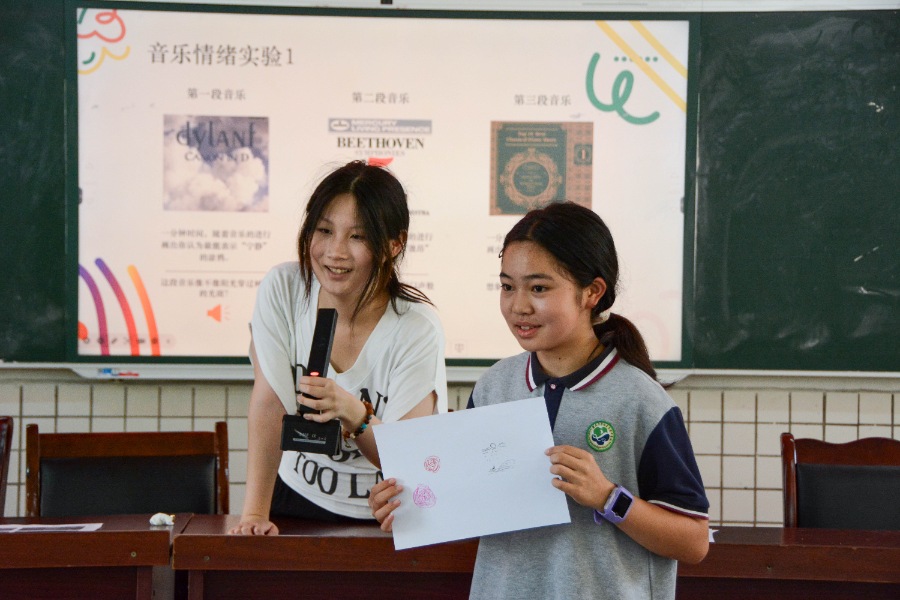 實踐團成員石悅琪精心設計的音樂情緒涂鴉課程為同學們開啟了一扇情緒表達的新窗口。課堂上,她以風格迥異的音樂片段為切入點,引導學生們沉浸其中,細膩地感受旋律中蘊含的情緒流動。隨后,學生們借助色彩與線條,將內心的感受涂鴉在畫紙上,化無形的情緒為有形的畫作。這門課程不僅讓同學們掌握了非語言情緒表達的獨特技巧,更在潛移默化中培養了他們的共情能力,為他們的情感世界增添了更多細膩與深度。