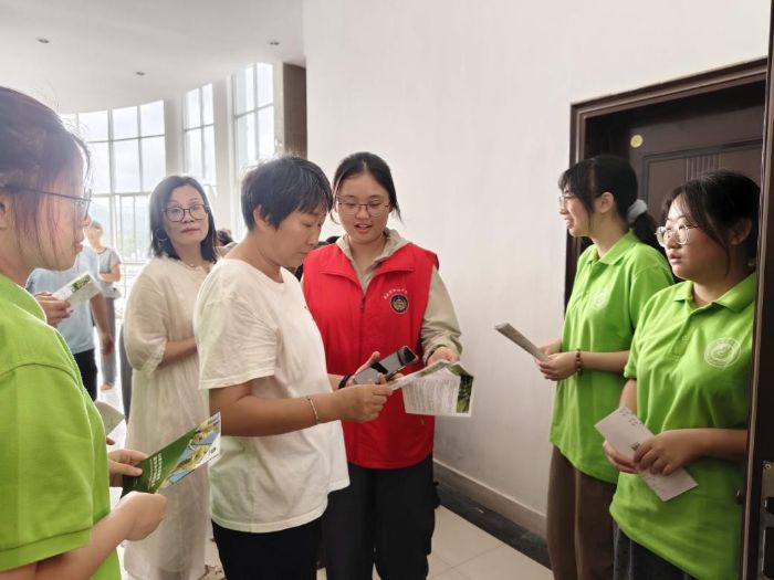 活動伊始,實踐隊員提前抵達會場開展布置工作。并化身為“科技使者”,在會場入口處向到場的種植戶及林業站工作人員發放宣傳手冊。該手冊經過精心地設計,將復雜的技術原理轉化為擁有清晰邏輯的文字介紹,并以圖文結合的方式,加深了受眾對于技術的理解。同時,在發放過程中,隊員們結合受眾身份進行針對性講解,向種植戶重點介紹果樹病蟲害防治相關內容,向林業站工作人員說明技術專家聯系方式等信息,有效調動了現場氛圍,使學員們開始主動討論手冊內容。此次預熱活動不僅增進了隊員與學員間的溝通,更為后續技術宣講的順利開展奠定了良好基礎。