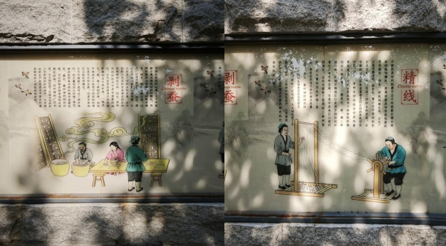 在周村絲綢文化園內,實踐團成員依次參觀了生絲加工、紡絲、養蠶、剝繭、精線、紡織等傳統絲綢制作工藝流程。通過絲綢染織技藝的詳細流程介紹,成員們了解學習了從蠶繭到絲綢成品的完整工序,深刻體會到周村絲綢“花形大方、色澤鮮艷、質地堅韌”的獨特魅力。展區內陳列的桑蠶絲布料、織繡錦緞民族服裝面料和人棉布料一些多樣化的絲綢樣品,為成員們搭建起直觀了解絲綢文化的實踐平臺,夯實了非遺技藝學習的實物基礎。