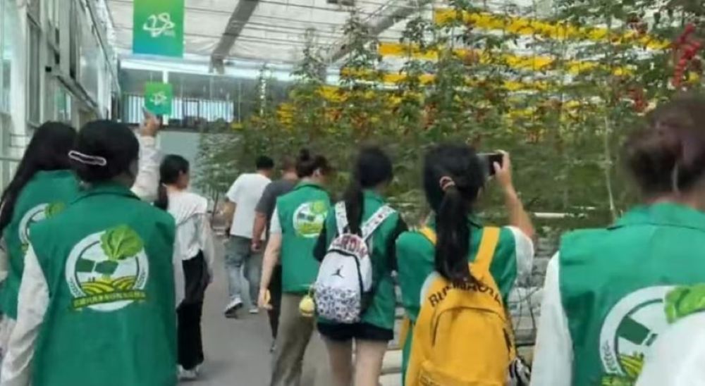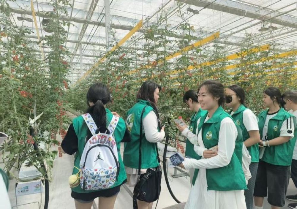 首先講解員帶領實踐隊走進壽光標準化蔬菜大棚,這里堪稱“植物生長的智能工廠”。在技術人員的引導下,隊員們看到了大棚內運用物聯網系統精準調控溫度、濕度、光照和CO₂濃度,無土栽培、滴灌施肥等技術讓各類蔬菜長勢喜人的現象,這生動展現了科技如何讓傳統農業煥發高效與優質的雙重活力。