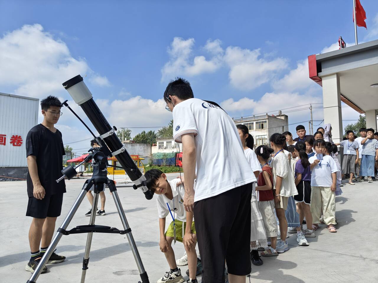 隨后,石煒凡同學為孩子們詳細講解天文望遠鏡的原理及使用方法,并與隊友、志愿者們一同組織太陽黑子觀測活動。孩子們通過望遠鏡近距離觀察太陽表面細節,親身感受天文的魅力,讓理論知識在實踐中得到深化。