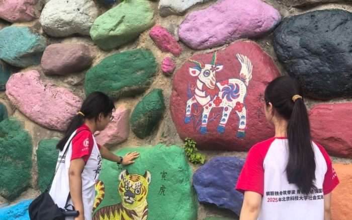 離開造紙作坊,龍王村的石頭畫為團隊帶來了新的驚喜。路邊石墻上,一塊塊普通石頭被賦予了鮮活生命:有的精心勾勒出二十四節(jié)氣的物候特征,春分的燕、霜降的楓,每一筆都蘊含著農(nóng)耕文明的密碼;有的細致描繪出十二生肖的靈動姿態(tài),虎的威猛、兔的憨巧,在石頭上躍然欲出。據(jù)村民介紹,石頭畫是近年來村里興起的特色文化。村民們就地取材,用畫筆將對生活的熱愛傾注于石頭之上,既美化了村莊環(huán)境,也成為傳承鄉(xiāng)土文化的新載體。陽光下,石頭上的色彩格外鮮亮,彰顯著龍王村的活力與創(chuàng)意。