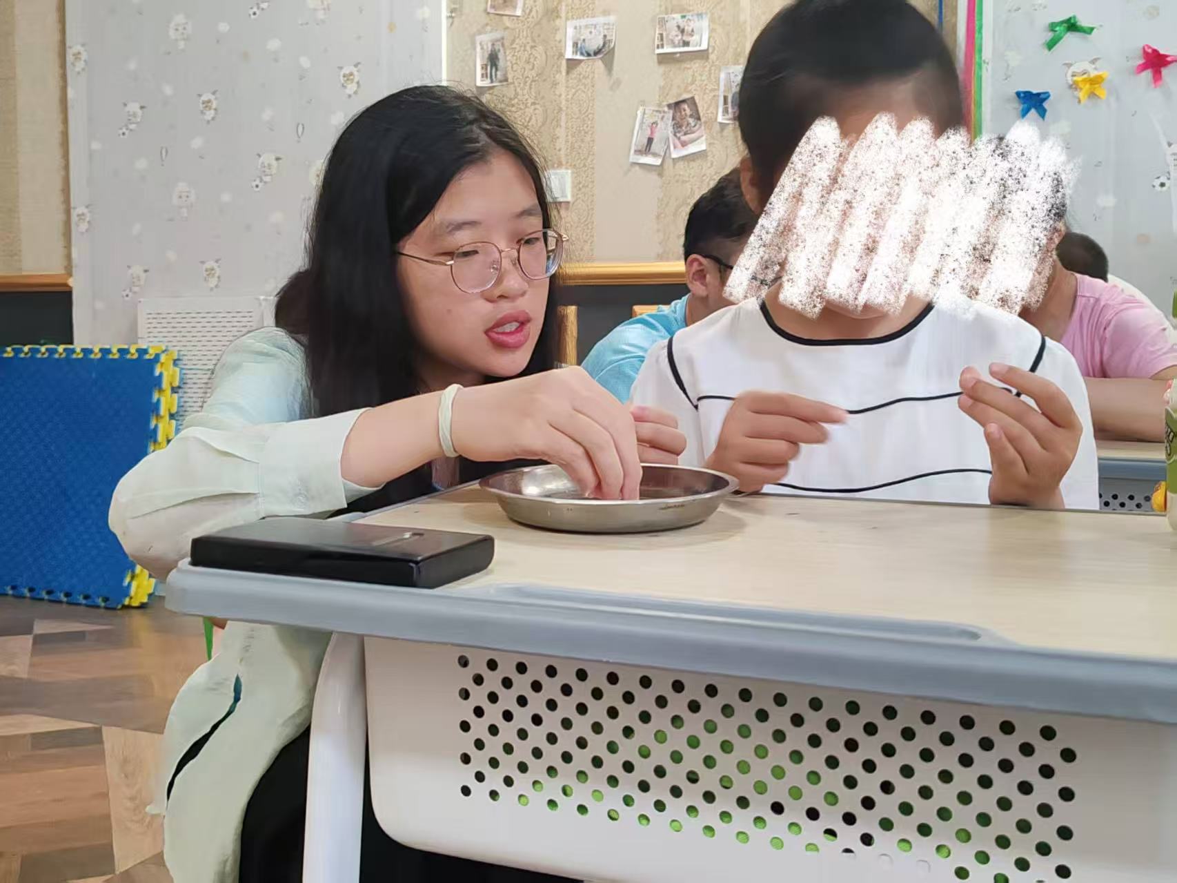 趣味蒙眼,共赴童真 活動室里,蒙眼游戲的布置剛完成,孩子們的目光就被深深吸引。實踐團成員和孩子們迅速組隊,兩兩搭配開啟挑戰。志愿者們蒙上雙眼,手搭在孩子肩頭,聽著指令小心移動、摸索,孩子們則化身 “小向導”,用稚嫩又堅定的聲音指揮:“往左一點,要碰到鼻子啦!”“往前伸伸手,嘴巴在這兒呀!” 摸索中,有人不小心碰到臉頰惹來一陣笑,有人精準 “命中” 五官收獲歡呼,歡笑聲、加油、指導聲,攪成一團暖烘烘的氣息,在房間里打轉。