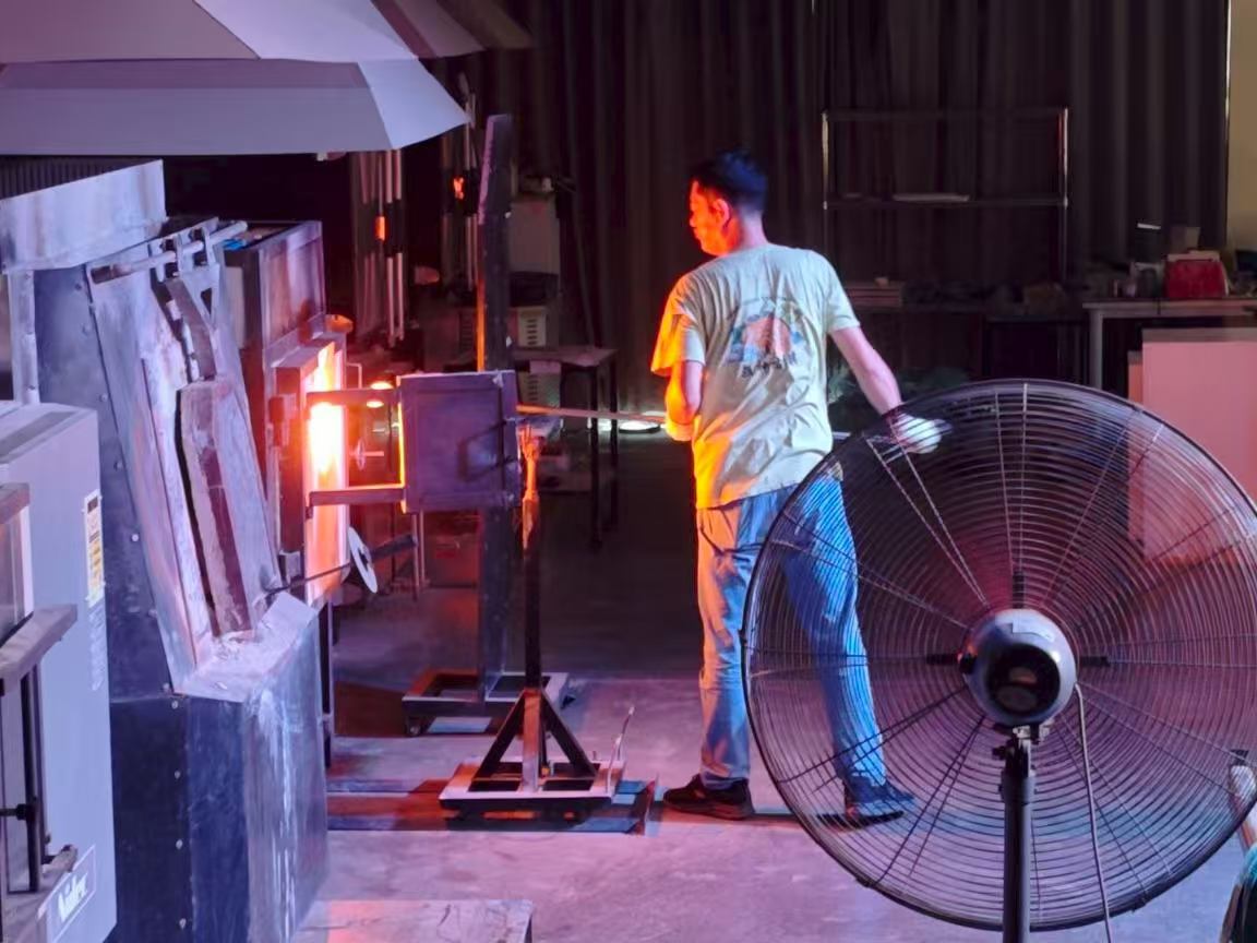 接下來朱老師用吹桿展示吹制的奧秘,老師舉起吹桿,吹入幾口仙氣,再借助舊報紙塑形,一個盤子就在我們面前成型,輕輕一敲便從吹桿上分離下來。演出結束后,隊員們對朱老師進行了一次簡單采訪,了解到匠人們在琉璃創作上極其嚴謹,從原料的配比到力度的掌控都親力親為并且精益求精。