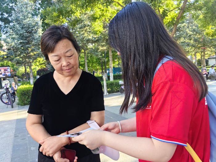 文化廣場上,成員們主動向攤主、游客講解普通話的實用價值。面對一位顧慮“年紀大了學不會”的阿姨,成員夏子贏巧妙地結合生活舉例:“您看,外地游客問‘博物館怎么走’,您用普通話指路,他們一聽就懂,這不就是很實用的技能嗎?”通俗的解釋讓阿姨露出笑容:“這普通話挺簡單的,還能幫到別人,挺好嘞。”