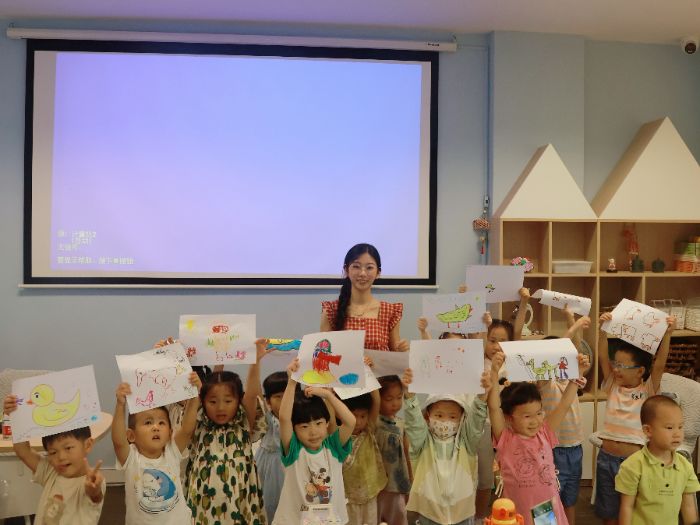 故事逐漸落下帷幕,小朋友們早已按捺不住創作的興致,紛紛化身故事里的創意小鴨,專注地用鴨子腳印繪制出生動的圖畫,有的將腳印當作楓樹的葉子,有的將腳印畫成一條條靈動的小魚,在畫紙上重現鴨子們用腳印作畫的奇妙場景,也將自己的奇思妙想融入其中。活動尾聲,小朋友們自豪地展示著自己的繪畫作品,燦爛的笑容與充滿童趣的創作相映成趣,為這場充滿智慧啟迪的繪本之旅畫上了圓滿句號。