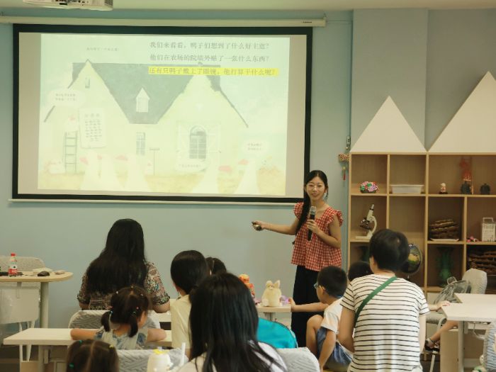 課程以一場生動有趣的《數鴨子》手勢舞教學拉開序幕,小朋友們在周濤的帶領下,興致勃勃地跳起活潑可愛的手勢舞,稚嫩的動作和歡快的笑聲為課堂注入了滿滿的活力。熱身完畢,小朋友們的目光聚焦到了繪本《價值100萬的好主意》上。在周濤繪聲繪色的講述中,大家跟隨一群失去農場主人的小鴨子,踏上了充滿波折與驚喜的智慧之旅。