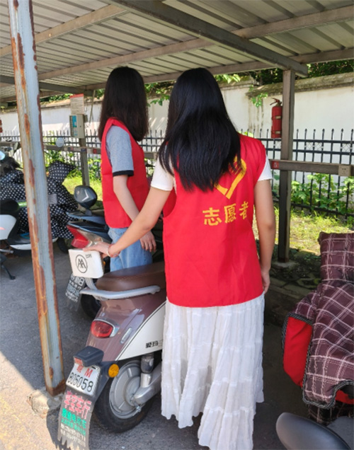 圖為隊長指導團隊成員整理車棚外違規停放的車輛 廖小玉 供圖