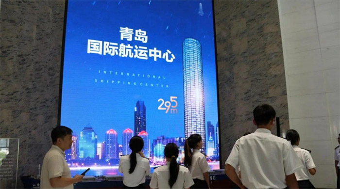 (圖4:山東海運海員勞務有限公司工作人員講解青島國際航運中心的建設歷程。張聞柏琳 供圖)