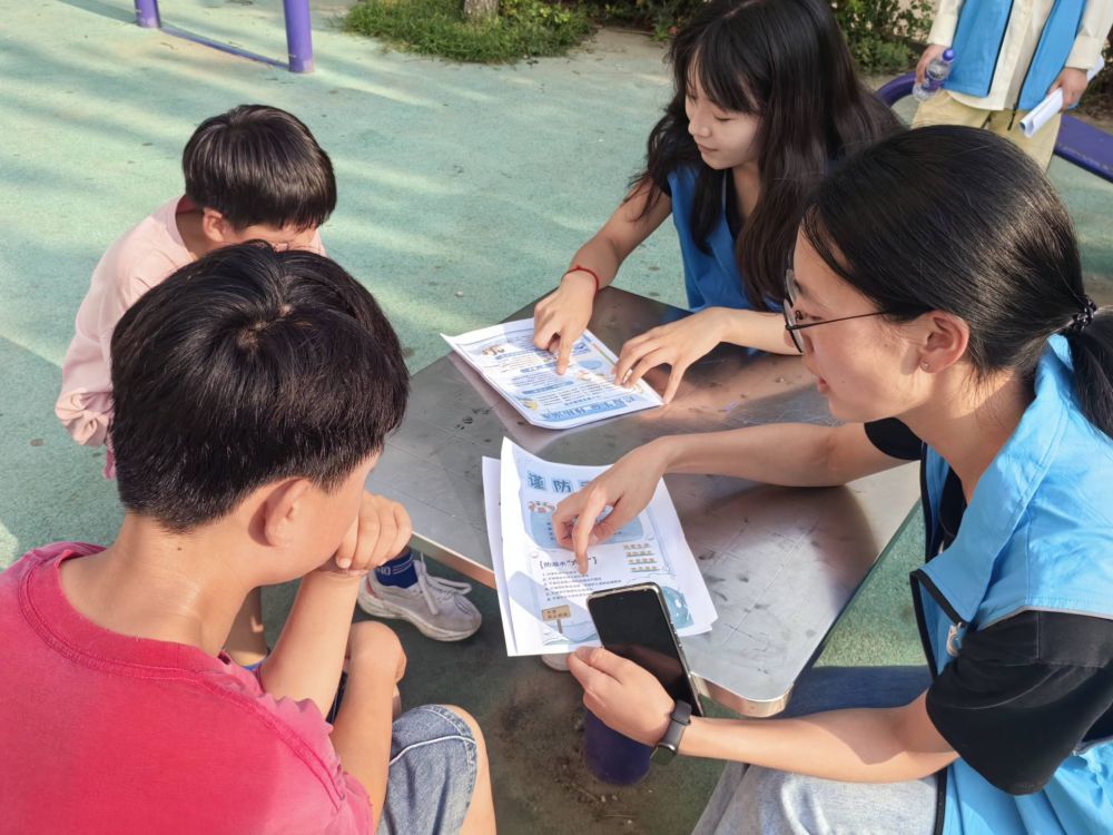 在“銀發反詐”方面,志愿者“面對面”與社區老人交流,用方言講解典型騙局,揭露常見詐騙手段。同時,志愿者還手把手教老人設置手機支付安全、識別詐騙信息,增強老年人的反詐騙能力。“童心防溺”則聚焦社區兒童,團隊成員通過發放防溺水安全知識手冊,集中向社區兒童講解防溺水“六不準”原則,以知識問答的形式讓防溺水安全教育知識牢牢記在孩子們的心中。