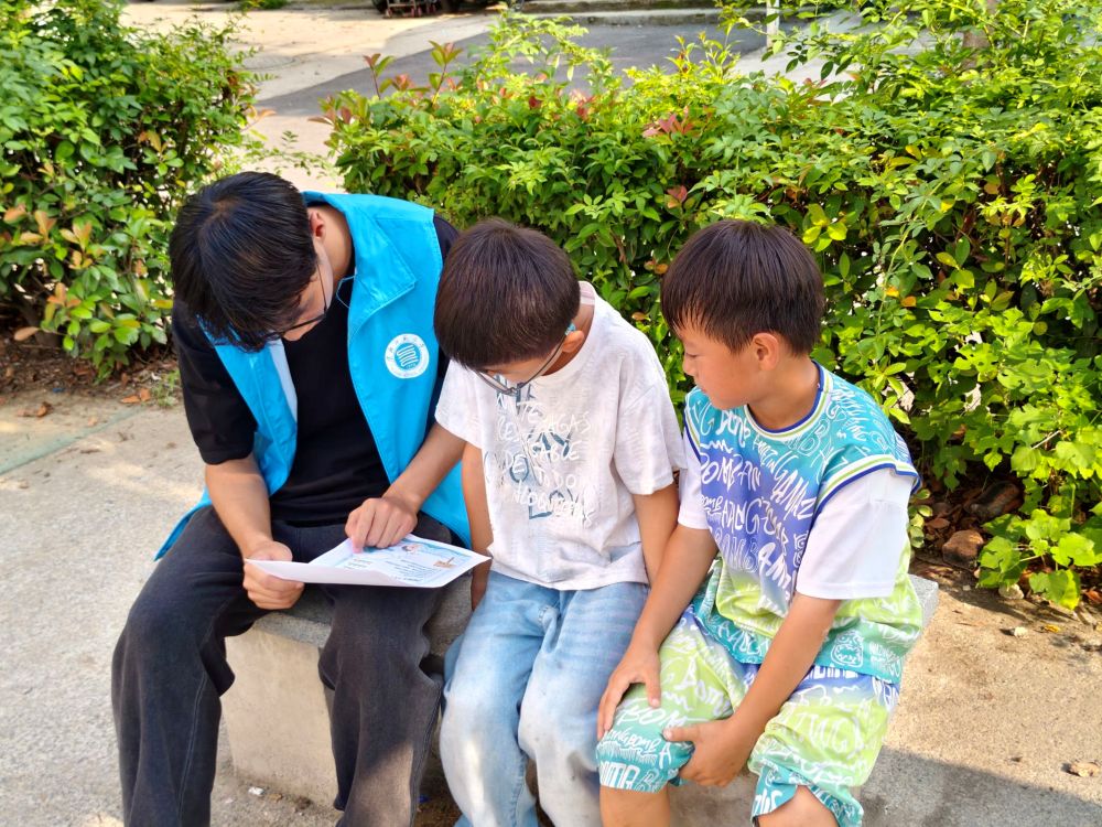 活動伊始,團隊成員在社區居民廣場處集合,分組展開活動。第一組針對社區兒童開展防溺水安全主題教育。暑期是兒童溺水事故的高發期,志愿者們通過分發防溺水主題海報、講解“六不”安全知識,向孩子們普及救生工具的使用、安全標識的識別以及發現他人落水時的正確救助方法。