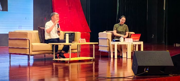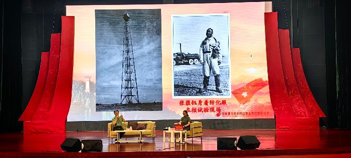 第二位嘉賓是中國核試驗基地開拓者張?zhí)N鈺將軍之子張旅天。他深情回溯父輩在我國核事業(yè)起步階段的奮斗歷程:從渤海之濱到西北大漠,張將軍將一生奉獻給中國核事業(yè)。同時,他通過講述父親與程開甲院士的故事,再現(xiàn)了那段歷史中特有的革命情誼。隨著主持人提問,張旅天同志將話題轉(zhuǎn)向“核二代”的成長點滴,“地堡屋、馬蘭城、能把小孩卷跑的沙塵暴……”這些細節(jié)讓實踐團成員感同身受,實踐團成員郭政辰感嘆:“張?zhí)N鈺將軍是一代核工作者的杰出代表。從渤海之濱到西北大漠,從戈壁鑄就核盾牌,夯實國防根基。他們的奉獻是馬蘭精神‘干驚天動地事’‘作隱姓埋名人’的縮影,激勵著我們傳承這份忠誠與擔當,永志不忘。”