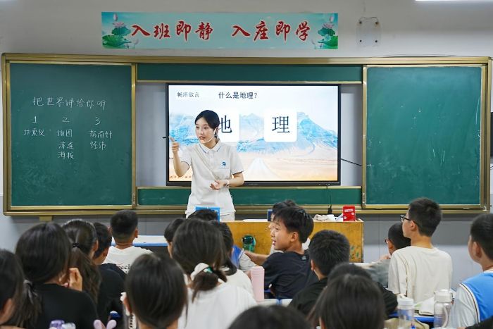 經過為期3個月的籌備,實踐隊設計了語數外音體美等基礎課程,還開設了地理特色課、“兩彈一星”專題課及普通話課程,促進學生綜合素質提升,為助力青少年拓寬視野、筑夢未來,培養其家國情懷和人文精神。在地理特色課程上,實踐隊隊員發揮專業優勢,將知識轉化為趣味體驗,引導學生探索身邊地理現象,增進對地理的理解。“兩彈一星”課程中,隊員用通俗語言講解核能原理和研發歷程,弘揚老一輩科學家的精神,在孩子們心中種下科技創新、強國建設的種子。
