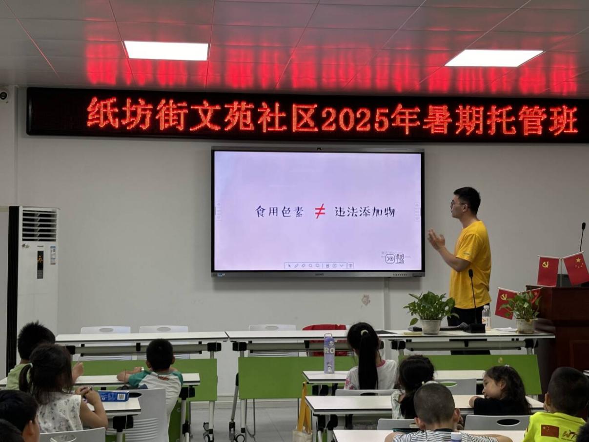 7月29日下午,一場別開生面的食品安全科普課在武漢市江夏文苑社區熱烈開講。華中農業大學食品科學技術學院“食品安全與營養中國行”博士團成員們化身“色彩魔法師”,為二十余名小學生帶來了主題為“抓住‘隱形調色盤’—— 帶你破解食品色素的魔法和秘密”的趣味科普課。課堂上,孩子們踴躍參與,笑聲與驚嘆聲此起彼伏,共同開啟了這場探索食物色彩奧秘的神奇之旅。
