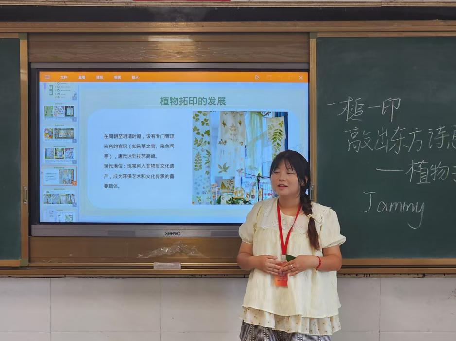 張佳美老師的植物拓印課開啟"自然藝術(shù)之旅",指導(dǎo)學(xué)生運用新鮮葉片、花瓣進(jìn)行創(chuàng)意拓印。從植物選取到色彩調(diào)配,從構(gòu)圖設(shè)計到成品裝裱,孩子們在動手實踐中發(fā)現(xiàn)自然之美,將夏日綠意永久定格在素色布帛之上,環(huán)保理念與審美情趣同步提升。
