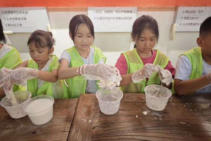 在實(shí)驗(yàn)部分,在助教鄧嘉琪、張露文指導(dǎo)下,混合揉面和靜置醒發(fā)工作有序完成,隨后孩子們自行動(dòng)手在水中揉搓面團(tuán)。通過反復(fù)換水洗去淀粉,當(dāng)彈性十足的面筋團(tuán)最終呈現(xiàn)時(shí),現(xiàn)場(chǎng)沸騰起來,孩子們興奮地喊道:“這是我做的‘孫權(quán)同款’!”
