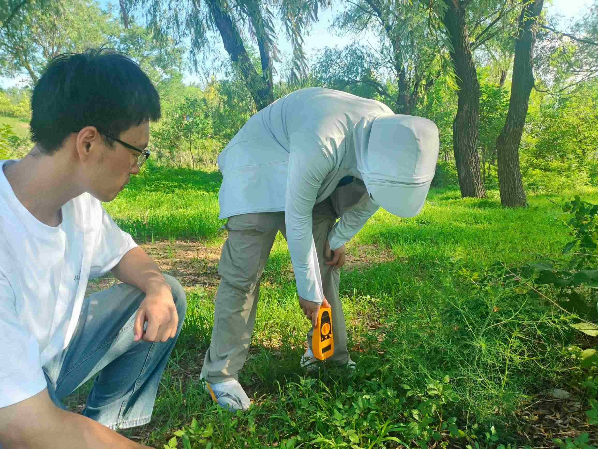 王磊老師現(xiàn)場示范植物樣方法調查技巧,指導同學們用樣方框劃定區(qū)域,細致記錄植物種類和數(shù)目。另一邊,取土樣小組手持采樣鏟、密封袋,按照“隨機多點采樣”原則,在不同植被覆蓋區(qū)采集0-20cm深度的土壤樣本,標簽上清晰標注采樣時間、經緯度與植被類型。濕度測定組則通過土壤濕度計,實時記錄不同地塊的土壤含水量,數(shù)據(jù)即時錄入調研表格。