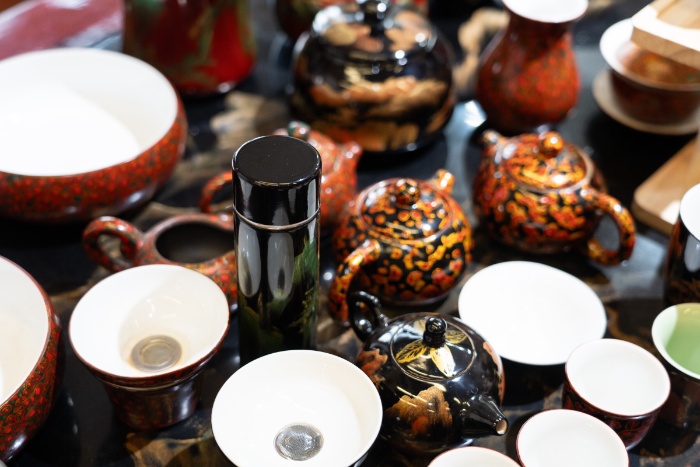 陳列的漆器茶具,黑紅主色調(diào)碰撞,紋理如歲月蝕刻。石磨漆器以天然漆為原料,經(jīng)制漆、胎型制作、髹漆等多道工序,是北川民族文化的具象體現(xiàn),承載著當(dāng)?shù)毓に噦鞒信c民族記憶。