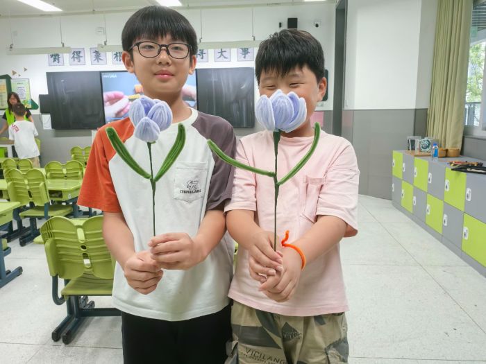 下午:扭扭棒巧編竹扇,非遺技藝薪火傳 午后課堂變身非遺工坊。我們的志愿者化身“南京非遺傳承人”,給同學們帶來“扭扭棒仿竹編扇”技藝體驗。她手持彩色的扭扭棒示范:“竹編講究經緯交錯,心要靜,手要穩。今天我們化繁為簡,用扭扭棒感受傳統智慧。”孩子們屏息凝神,模仿老師將扭扭棒縱向固定為“經線”,再靈巧地橫向穿插編織“緯線”。起初,扭結、松垮困擾著不少小手,在志愿者們手把手指導下,生疏的動作逐漸流暢。紅色與金色的扭扭棒交織成菱格紋,翠綠色勾出竹葉輪廓——一把把迷你竹扇在指尖綻放。“看!我的扇子像好不好看?”同學們紛紛展示自己編織的竹扇。活動中,志愿者老師娓娓道來竹扇“清風徐來”的文人雅趣,讓孩子們在動手間體味“以竹喻節”的文化內涵。
