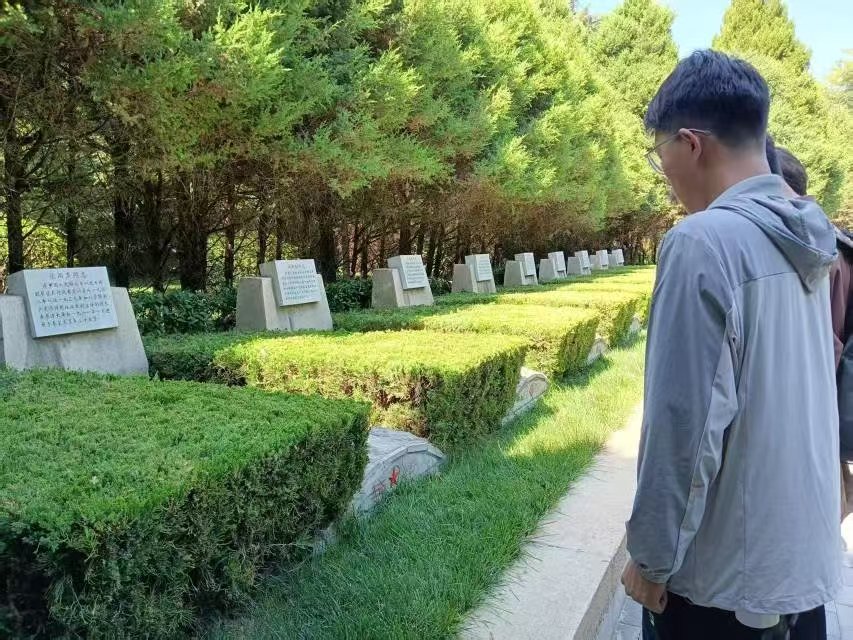 7月7日上午,團隊集體乘車前往華北軍區烈士陵園,途中王華興向大家強調了交通規則與園區禮儀等注意事項。到達后,隊員們瞻仰了烈士紀念碑、墓區及紀念館,聆聽了革命事跡講解。隨后,舉行了默哀儀式,深切緬懷華北軍區烈士的英勇奉獻。期間,胡曉蕾負責拍攝活動照片、錄制視頻,隊員們分組完成“烈士事跡收集卡”記錄任務。