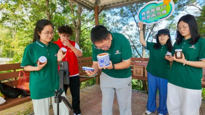 直播間里,隊員們化身“助農主播”,用標準普通話向網友展示兩當縣的優質農特產品。在蜂房旁,隊員展示中蜂的天然釀造環境,講解生態養殖模式;在花椒樹下,實時分享剛摘下的鮮紅花椒“麻香鮮爽”的品嘗體驗;在五黑雞養殖基地,以采訪問答形式訴說感受。從蜂蜜、花椒到五黑雞、綠殼雞蛋,隊員們結合實地探訪經歷,系統介紹當地“一主四輔一特”產業發展模式,讓網友直觀了解農產品的種養殖規模、生長周期與獨特品質,助力“全域有機”品牌走向更廣闊的市場。據統計,本次直播共設計產品講解稿8篇,吸引觀眾7000+人次,收獲點贊量超2萬次,促成蜂蜜、花椒等農產品銷售額超過2000元。