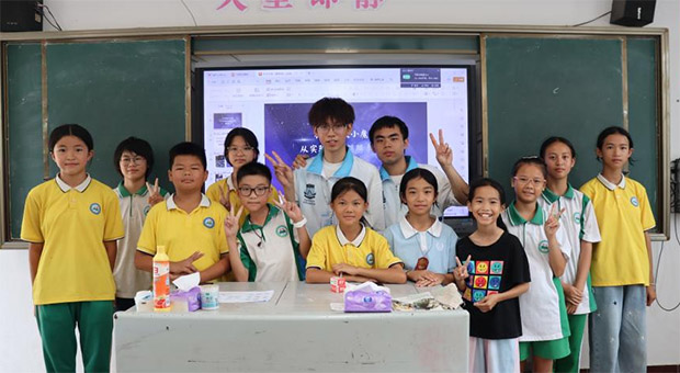 圖為孩子們完成實(shí)驗(yàn)后與實(shí)踐團(tuán)成員合影