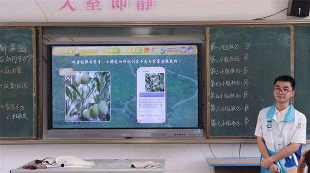 “大家好,我是漁小耀,今天我將和大家一起穿梭到不同時(shí)期的麒麟山果園!”在另一課堂上,實(shí)踐團(tuán)成員劉尹渝引入虛擬助教漁小耀,帶領(lǐng)孩子們化身果農(nóng)、穿梭時(shí)空,親歷麒麟李在不同時(shí)期的困境:種植期病蟲(chóng)害侵襲、成熟季人工遴選低效、銷(xiāo)售期渠道局限。在整個(gè)課堂中,漁小耀能即時(shí)回應(yīng)孩子們的發(fā)現(xiàn)和疑問(wèn),并進(jìn)行實(shí)時(shí)的互動(dòng)答疑。這種嵌入情境的即時(shí)交互打破了傳統(tǒng)課堂中等待老師解答的局限,讓孩子們的求知欲得到了及時(shí)的滿足。