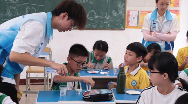 圖為實(shí)踐團(tuán)成員董文輝指導(dǎo)孩子們完成牛奶變裝秀實(shí)驗(yàn)
