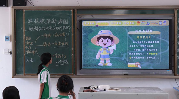 在識(shí)別病蟲(chóng)害環(huán)節(jié),劉尹渝巧妙利用交互AI智能體,讓孩子們化身“害蟲(chóng)小偵探”,觀察葉片與果實(shí)圖片猜測(cè)病蟲(chóng)害,再利用AI智能體的識(shí)別功能驗(yàn)證答案,直觀感受人工智能在農(nóng)業(yè)診斷中的便利性與精準(zhǔn)性。此外,通過(guò)漁小耀的介紹,孩子們還了解到了遙感技術(shù)、5G一體化智能監(jiān)測(cè)系統(tǒng)在識(shí)別與防治病蟲(chóng)害的應(yīng)用,云端果園自媒體宣傳、直播帶貨在銷(xiāo)售麒麟李中的重要作用。