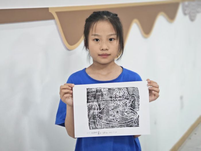 圖為孩子們正在展示制作的浮雕版畫 王晨攝