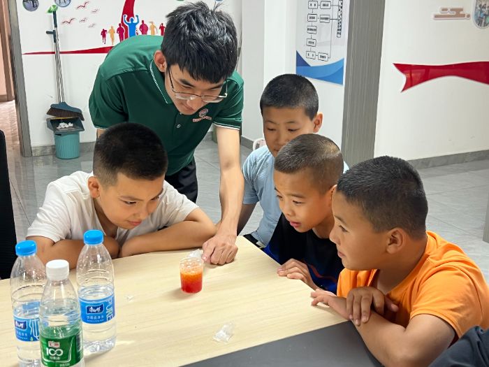 以海洋知識為主題,實踐隊員開啟了上午的教學(xué)活動。實踐隊依托學(xué)校海洋學(xué)科優(yōu)勢,設(shè)計了“海洋五層生態(tài)結(jié)構(gòu)”“海洋重要性”等教學(xué)環(huán)節(jié)。在講解過程中,孩子們展現(xiàn)出了濃厚的興趣,尤其是當講解到海洋民俗和傳說時,他們的熱情更是高漲,并主動分享自己所知的海洋民俗。為了強化教學(xué)內(nèi)容的生動性,實踐隊還組織了海底火山小實驗,借助廚房常見材料復(fù)刻深海熱液場景,引導(dǎo)學(xué)生在動手操作中學(xué)習海洋知識,讓孩子們在親手操作中直觀感受海洋的奧秘。實驗過程中孩子們積極參與并主動分享自己對實驗的理解和想法,現(xiàn)場氣氛活躍。在介紹海洋知識的同時,實踐隊成員也強調(diào)了中國海洋大學(xué)在海洋科學(xué)領(lǐng)域的特色和優(yōu)勢,向孩子們介紹了中國海洋大學(xué)在海洋生物、海洋地質(zhì)、海洋化學(xué)等方向的研究成果,以及學(xué)校在海洋環(huán)境保護和海洋資源開發(fā)方面的貢獻。通過這些介紹,孩子們在學(xué)習海洋知識的同時還對中國海洋大學(xué)有了更深入的了解,激發(fā)他們對海洋科學(xué)的興趣和向往。